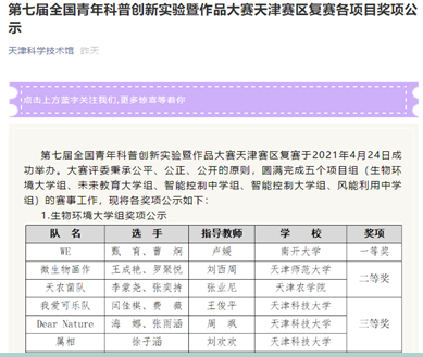 近日,第七届全国青年科普创新实验暨作品大赛天津赛区复赛结束,公司学生提交的作品在百余件作品中脱颖而出,2件作品进入天津赛区复赛,其中生物学实验中心刘西周老师指导的王成艳、罗聚悦同学的作品“绘疫缩影”在生物环境大学组获得二等奖(第2名)。