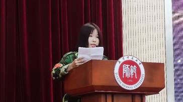 新生代表生物科学(师范)2303班胡欣彤发言,她表示初入师大,学校的时间广场和正中央的钢笔尖让她印象深刻,进入校门后热情似火的学长学姐以及团结友爱的班级氛围让她对大学四年的生活充满期待,校园里随处可见的“小精灵”以及动物的叫声,都令她深刻的感受到生命的灵动与力量,她表示今后要满怀期许地做一粒“向阳的种子”,去探索“生命的奥秘”。