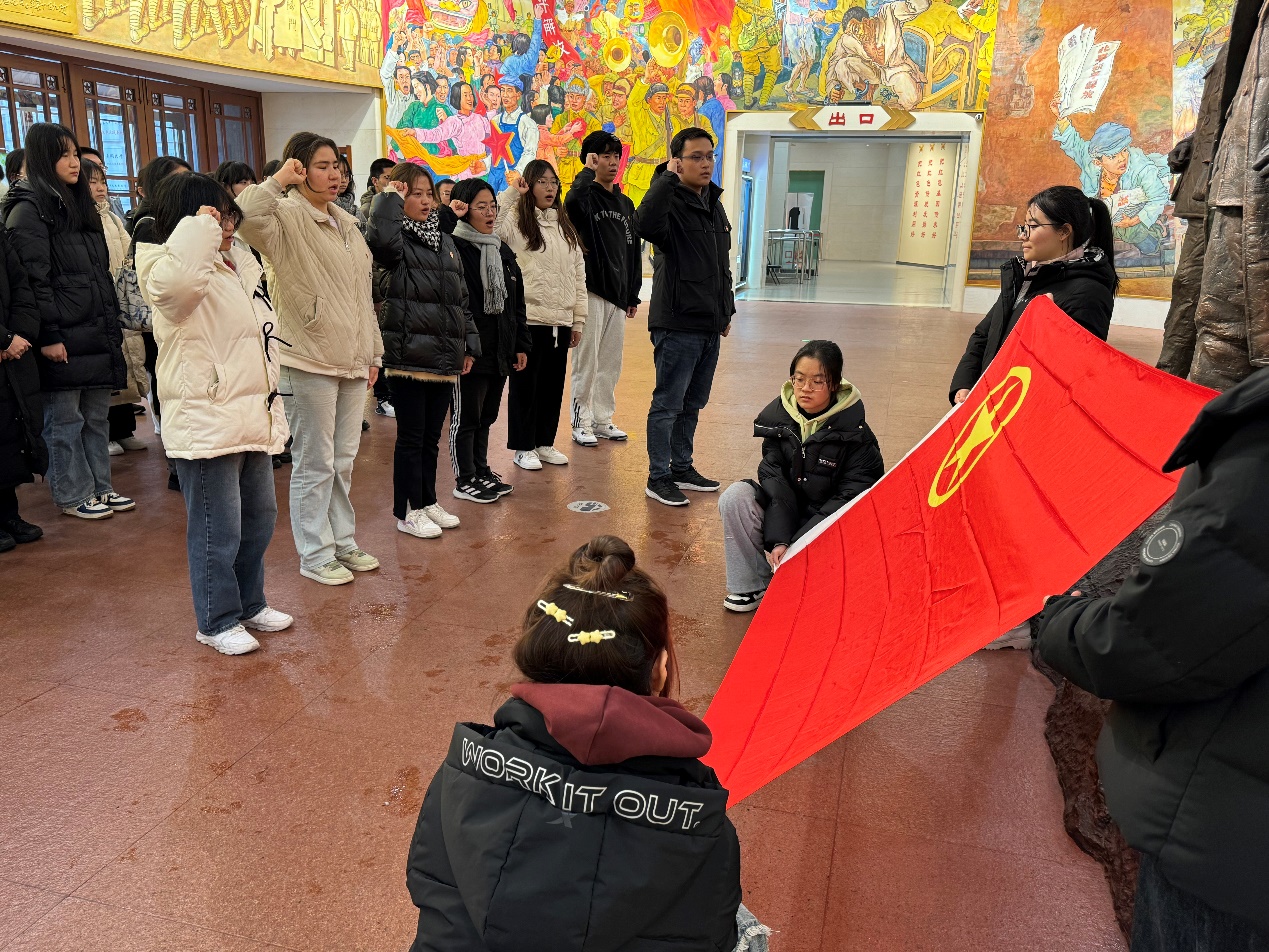 院团委书记单一鸣现场为学生讲授《在铭记历史中汲取奋进力量》主题团课,青年党员团员身处复原后的火线广播室、浴血战壕,如同时光倒流,历史瞬间被唤醒,通过缅怀所有惨遭侵略者杀戮的死难同胞,致敬所有为中国人民抗日战争胜利、解放战争胜利献出生命的革命先烈和民族英雄。团课结束后为新发展团员进行入团宣誓并佩戴团徽。