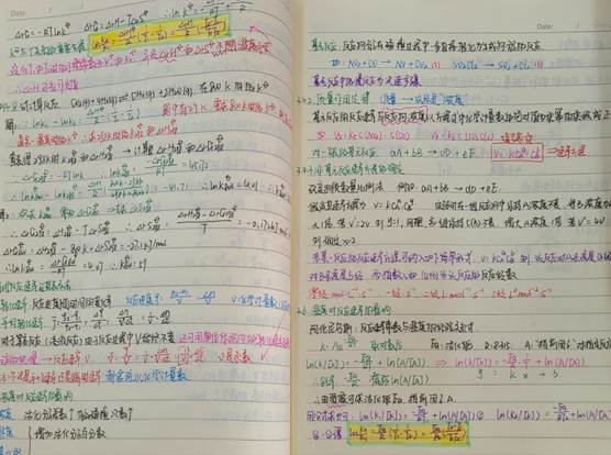 王婧同学的笔记用不同颜色的笔对重点内容进行了突出显示,如用紫色笔标注的化学反应注意事项、用蓝色笔标注的化学反应式等,这种突出笔记有助于学习者更好地把握学习重点和难点。