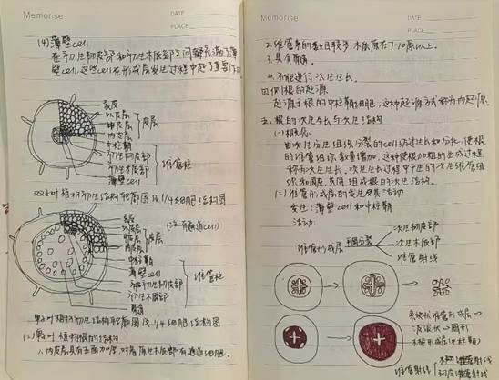 邱少婷同学的植物学笔记精炼扼要,对薄壁细胞、双子叶植物和单子叶植物的初生结构、根的次生生长和侧根的起源等核心内容进行了梳理和记录,笔记的逻辑性和图文并茂的呈现方式也有助于提高学习兴趣和理解效果。
