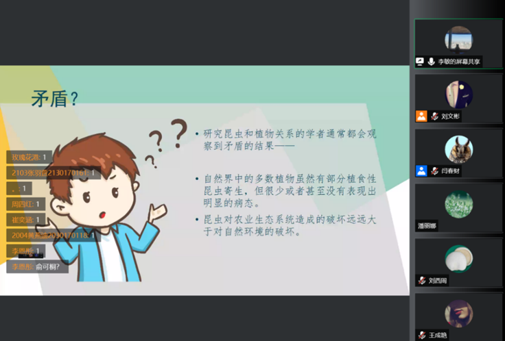 2022年6月10日晚上19:30,李敏教授带来了“昆虫与植物的灵动世界”的科普。李敏教授通过介绍昆虫在动物界的占比最多,同时昆虫主要以植物为食,提出了昆虫和植物存在相互协同的作用。李敏教授首先介绍了植物进化出保护自己的两种方式,而面对植物的防御,昆虫也进化出了种种对策。随后又介绍了植物-美国白蛾-周氏啮小峰的故事,让同学们深刻的体会到昆虫对植物选择的重要性。紧接着介绍了许多植物和昆虫之间互利共生的生活实例。活动最后,李敏教授希望通过本次科普活动让民众深刻的体会到尊重自然规律的重要性。